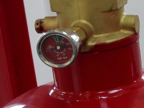 如果用扳手逆时针缓慢旋转压力表后的六角螺帽,压力表指针指向压力上升,但是没有到达绿区,表示钢瓶内的灭火剂或者增压氮气有泄漏,这时,需要联系生产厂家或者有资质的维保单位对系统进行维保。